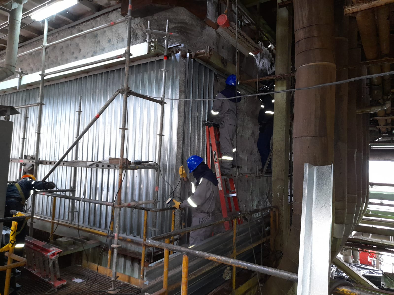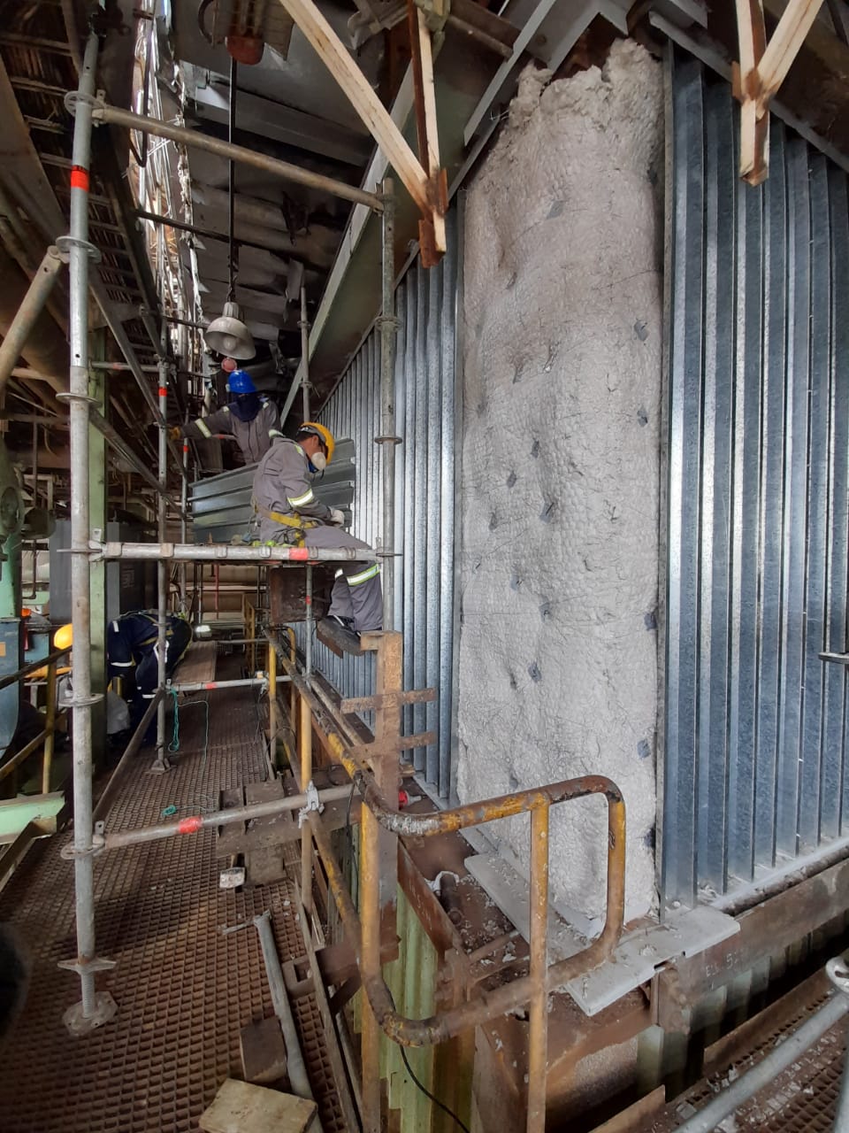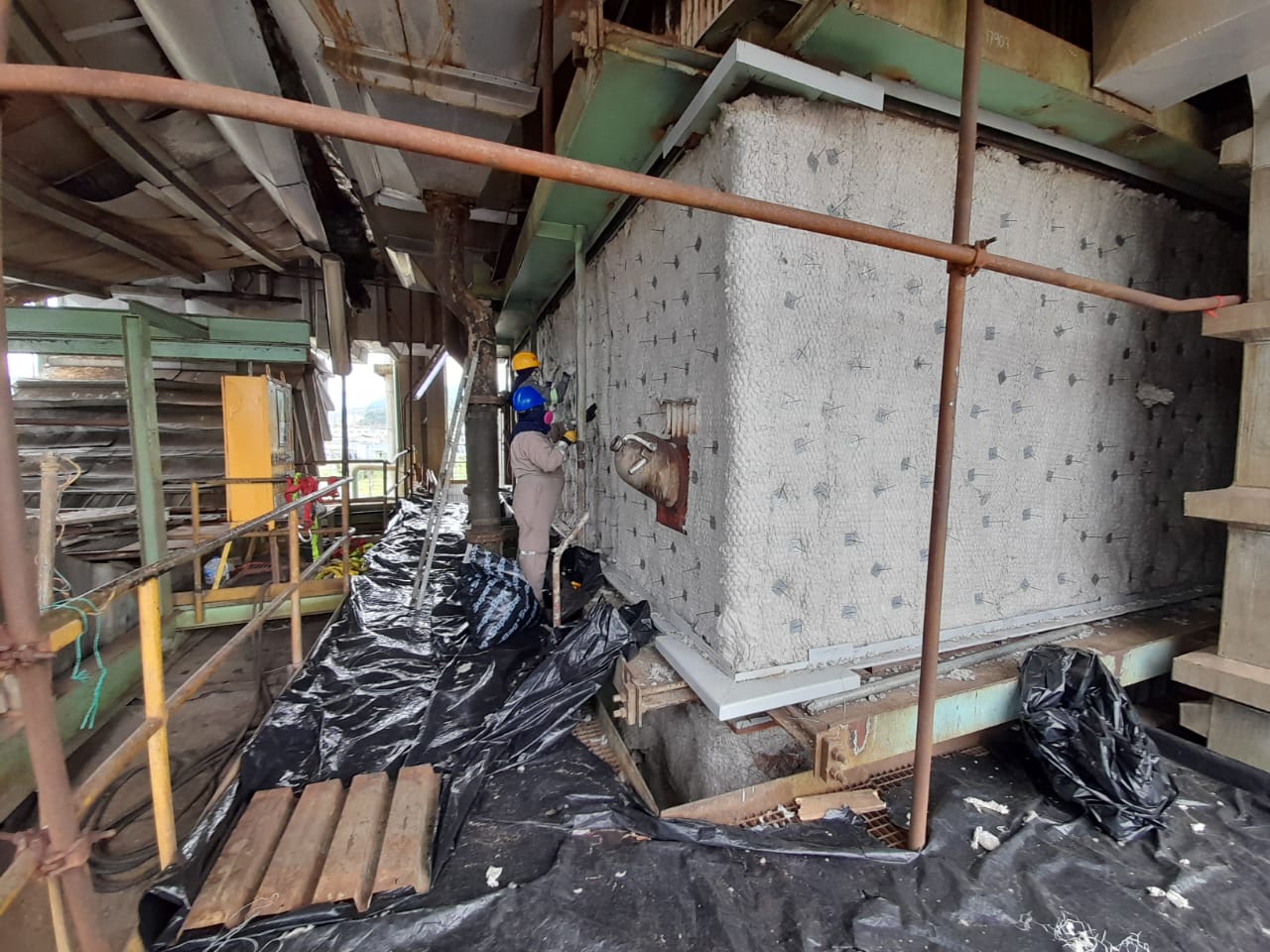 Instalación de sistema de aislamiento térmico multicapa con protección mecánica de acero galvanizado para paredes de caldera.